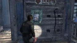 - Cerca de las escaleras que suben a la estación del teleférico, se puede ver un cartel que auspicia Devil's Pit, donde sale gente de pie y una en silla de ruedas con la cara tapada. Una referencia a The Wheelman.