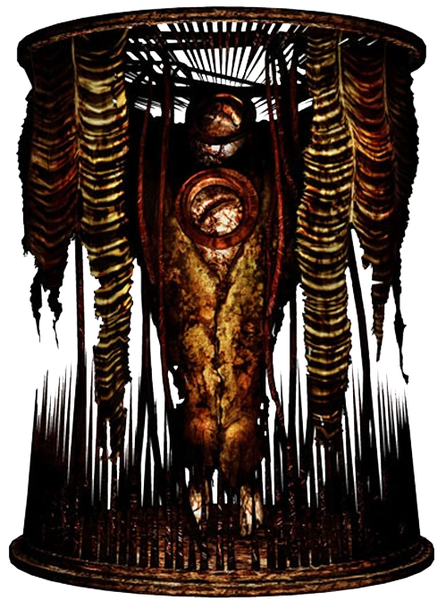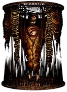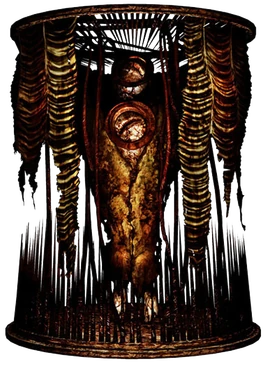 Su aspecto se asemeja al de un monstruo muy alto y recubierto de piel en descomposición, y está atrapado dentro de (o parte de) una jaula cilíndrica que rodea todo su cuerpo. La parte inferior de la jaula está adornada con una gran variedad de pinchos afilados, similares a las estalagmitas, mientras que la parte superior está cubierta de la piel del monstruo y de protuberancias, que podrían actuar de manera de tentáculos. A los pies del monstruo parecen haber varios dientes puntiagudos, dando la impresión de que está suspendido dentro de su jaula. Además, posee un par de bocas que convulsionan y se retuercen en su pecho y en su "cabeza".