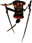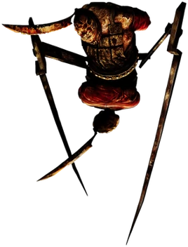 Es un monstruo de cuerpo metálico con dos cabezas y grandes cuchillas. Tiene la apariencia de dos torsos humanos partido por la mitad y conectados por las caderas por un dispositivo metálico. Sus brazos están atados y vendados a sus espaldas. Las piernas con forma de cuchillo salen desde el centro del dispositivo mecánico. También tiene un cuchillo junto a cada una de sus cabezas girando el torso (como un péndulo).