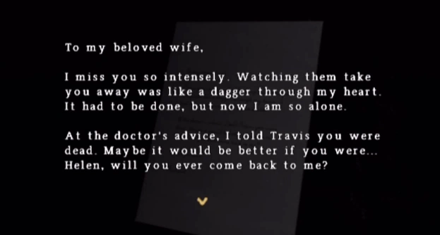 Nella lettera, Richard parla dei suoi sensi di colpa per aver dovuto farla ricoverare e del suo dolore per essere lontano da lei. Egli, inoltre, afferma anche di aver detto a Travis che sua madre in realtà è morta.