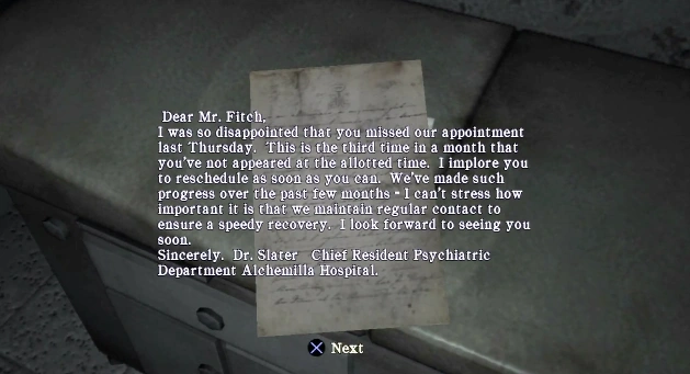 La Lettera del Dottor Slater è un documento che appare in Silent Hill: Homecoming. Si trova nell'ambulatorio dello Studio del Dottor Fitch ed è stata inviata dal dottor Slater, il capo del reparto di psichiatria dell'Ospedale Alchemilla, a Martin Fitch, che si sottopone a una terapia psichiatrica dopo la morte di sua figlia Scarlet.