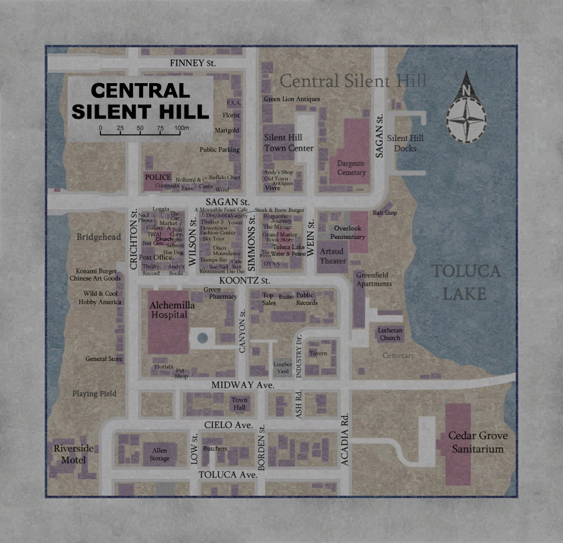 Questa è la mappa completa di Silent Hill Centrale, che include le informazioni di Silent Hill 1, Silent Hill: Origins, e Silent Hill: Homecoming. Questa mappa aiuta a capire la struttura di Silent Hill Centrale dopo Homecoming.