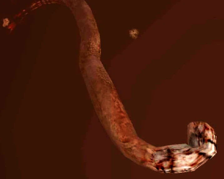 По внешнему виду монстр похож на нечто вроде угря или пиявки телесного цвета, без видимых глаз или рта.