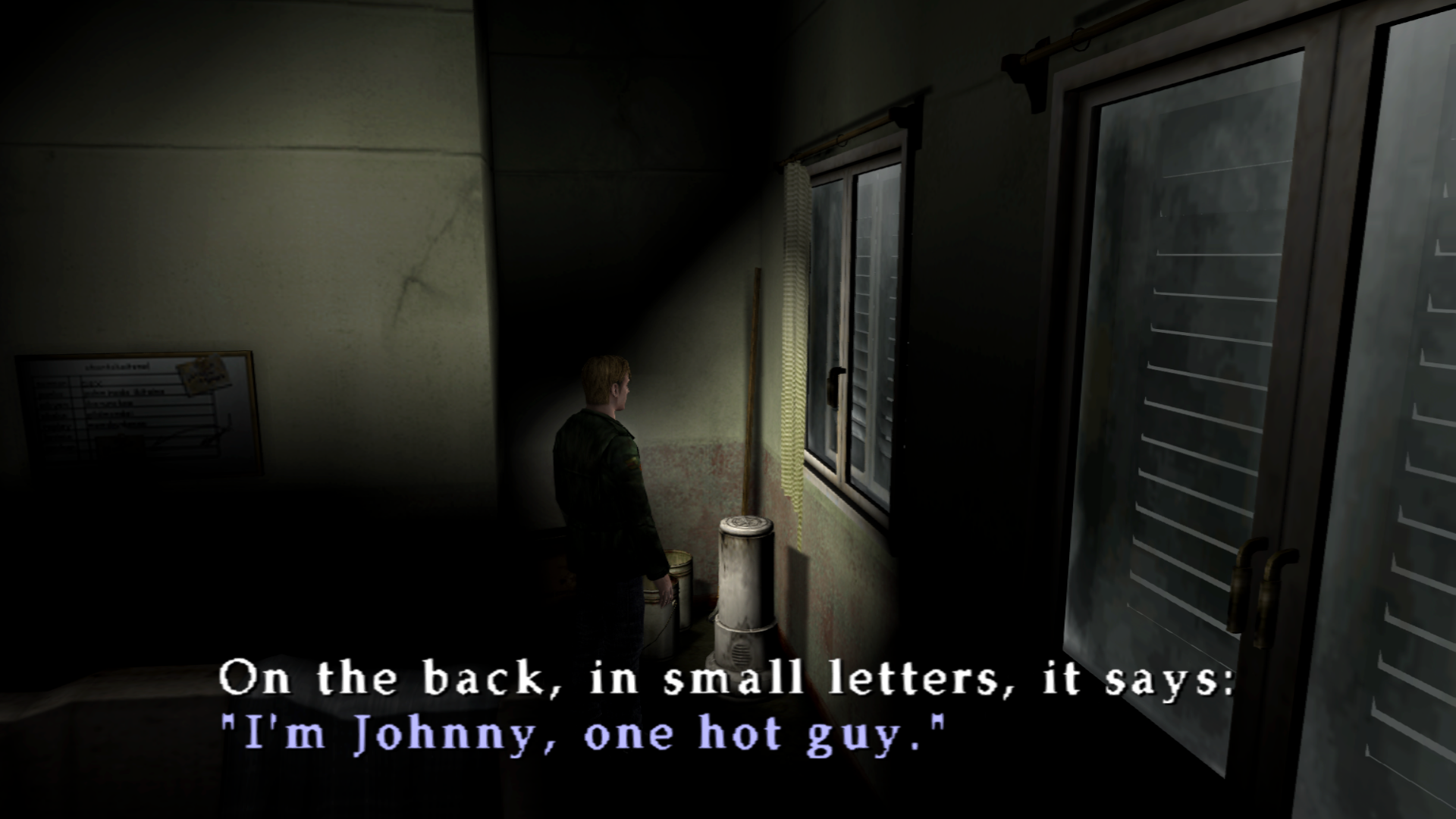 При осмотре обогревателя в углу комнаты Джеймс скажет: «Здесь обогреватель. Сзади маленькими буквами написано: „Я Джонни, такой горячий парень“». При внимательном рассмотрении оказывается, что обогреватель находится очень близко к занавеске. Возможно он был неисправен, в результате чего искра зажгла занавеску над ним, что привело к пожару в отеле «Лейквью».
