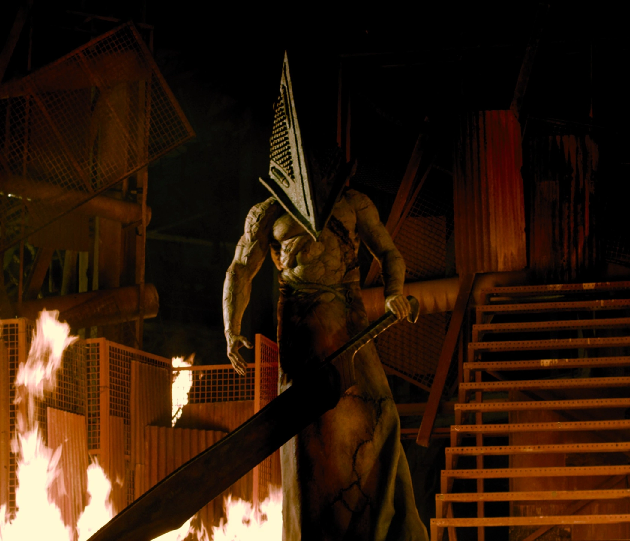 - Основной принцип дизайна из игры по-прежнему присутствует: шлем выглядит болезненным для ношения. Однако Пирамидоголовый не совершает никаких жестов с шлемом как в игре.