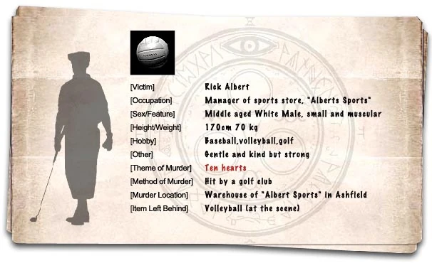 Пропал волейбольный мяч… Рик Альберт, хрупкий, но заядлый спортсмен, искал волейбольный мяч на своём складе, когда сотрудник магазина, работавший на полставки, ворвался на склад и взволнованно сообщил Рику, что владелец зоомагазина был убит. Он пояснил, что тот был застрелен из пистолета-пулемёта, его сердце было удалено, а на спине был вырезан символ. Рик поинтересовался, откуда он узнал столько деталей об убийстве.