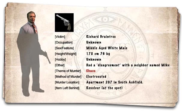 Позже Генри заходит в квартиру Ричарда в ином мире, где видит как маленький Уолтер указывает в окно на квартиру 303 и растворяется в воздухе. Генри пытается помочь Ричарду, прикованному на электрическом стуле с надписью на лбу "19/21". Ричард говорит Генри: "Ребенок? Это не ребенок... Это человек 11121." не в состояние помочь, Генри вынужден смотреть, как тот умирает. Тема убийства Ричарда является "Хаос". Предмет, оставшийся после его смерти, - это фирменный револьвер, который Генри позже может получить в качестве оружия.