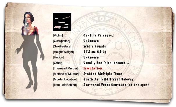 - Незадолго до финальной сцены Синтии на сцене присутствуют предметы макияжа и содержимое женской сумочки, которые подразумеваются как ее собственные. Тем не менее, у Синтии не было сумочки на ней все время, пока игрок был рядом с ней раньше.