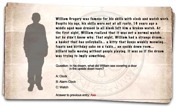 Уильям Грегори был известен своим умением работы с часами. Несмотря на возраст, его навыки нисколько не притупились. Шестнадцать лет назад мужчина среднего возраста, одетый во всё чёрное, оставил ему сломанные наручные часы. С первого взгляда Уильям понял, что это были не обычные часы, но он не знал почему. В ту ночь Уильям видел странный сон… Корзина с волейбольными мечами… слабо мяукающий котёнок… пиршество и торт ко дню рождения на столе… комната, перевёрнутая сверху вниз… движущиеся бильярдные шары без играющих людей. Как будто сон пытался поведать о чём-то.