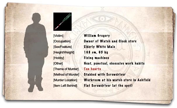 Уильям Грегори (англ. William Gregory) был пожилым мужчиной, владельцем магазина часов в Эшфилде, убит за десять лет до событий Silent Hill 4: The Room. Уолтер Салливан проткнул его отвёрткой и удалил его сердце. Предмет, оставленный на месте преступления — отвёртка, вероятно та самая, которой Уильям и был убит.