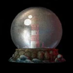 The memento is a snow globe, with a lighthouse and a girl in red within the globe. On the bottom of the snow globe base is a price tag showing the price ($9.93) and a quote from Psalm 104:2: