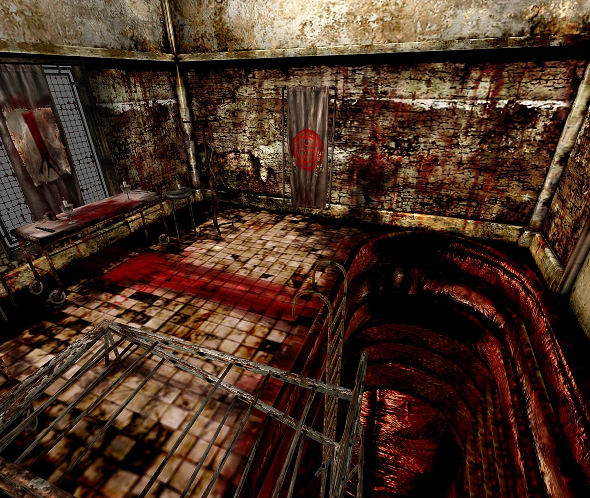 The effects of Nowhere and the Otherworld is also very explicit here; for example, a church normally wouldn't contain abysses that drop into voids, wheelchairs and gurneys, huge fans, a morgue, etc. The floors and walls have become rusted, grated metal and blood is found staining most surfaces. Many dead bodies are also strewn about, and gurneys and hospital equipment litter the hallways.