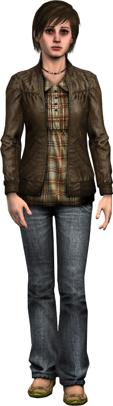 In the present, Cheryl wears a brown jacket over a buttoned plaid blouse with jeans and green slippers. In the PlayStation versions, she is seen wearing a black jeweled necklace.
