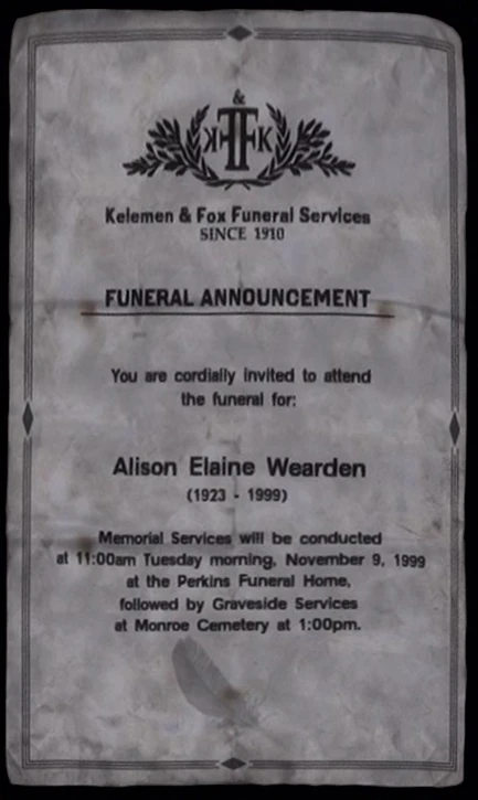 The Funeral Announcement is found in Silent Hill: Downpour, on a bed in the bedroom of a house on Rice Street in Pleasant River. This is an invitation to the funeral of a seventy six year old woman named Alison Wilson at Perkins Funeral Home.