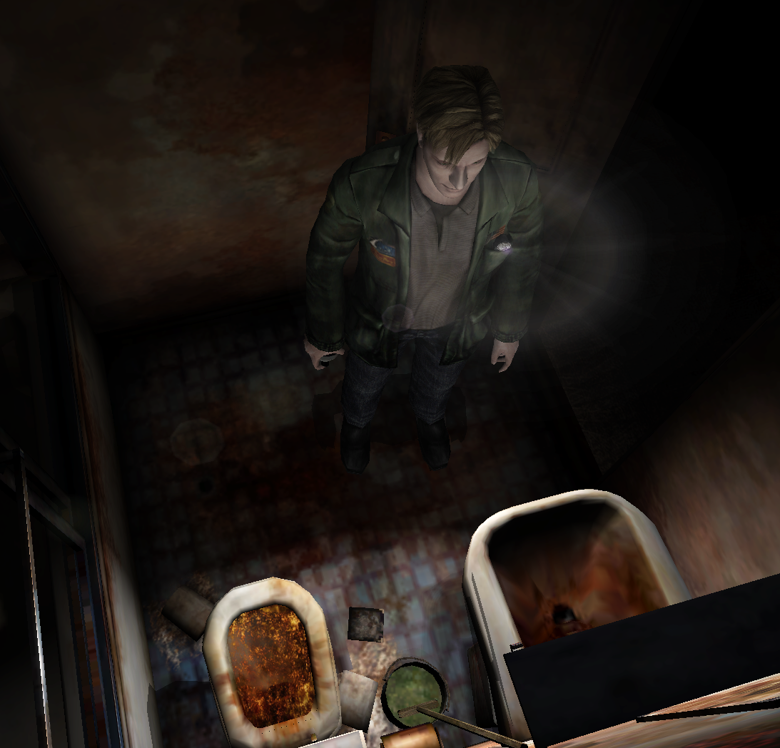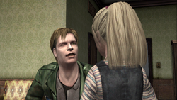 James is also referenced by Heather in an optional cutscene. In the shopping mall, she begins to dislodge a toilet but stops, saying, "Forget it. This is way too gross." She then stares at the player and asks, "Who would even think of doing something so disgusting?" This cutscene is only unlocked if the player has a Silent Hill 2 save file.