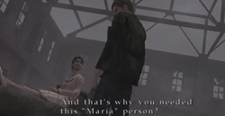 - Maria - The woman is Mary. She becomes furious with James for what he did and transforms into the final boss. After killing her, James is seen looking down at the lake in Rosewater Park. Maria appears, resurrected again, and asks James whether he killed Mary again. He believes the encounter with Mary was just another illusion and asks Maria to be with him. Maria then gives James Mary's letter. James and Maria leave Silent Hill, however, Maria coughs, implying that she will become sick like Mary and the events that drove James to murder may repeat themselves. This is another ironic ending because Angela told James that he "probably found someone else" to which James replied, "That's ridiculous."