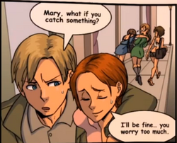 Three years prior to the game, Mary was struck with a terminal disease, and she deteriorated to the point of having violent mood swings, lashing out at James in anger. Her doctor predicted she would have less than three years left to live and told James that there was no effective treatment for her condition. James questioned Mary's doctors about her illness, and could not believe they would just let Mary die. He searched through medical books for information about Mary's illness, but never found anything useful. Later in her illness, James visited Mary less frequently because she was emotionally volatile. Her mood swings left him bewildered about what was "right" to do. Mary's and James' wish of having children was also put to an end due to her disease.[4]
