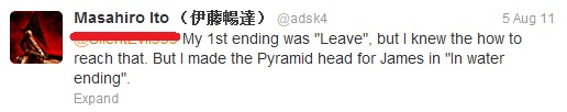 - Masahiro Ito and Guy Cihi both choose "In Water" as their personal canon ending, though Ito also said "I think there are so many real ending for each user/player." Cihi prefers the "Leave" ending.[9][10][11][12][13][14][15] Cihi initially thought the Leave ending to be his personal canon as it was the best outcome for James and felt James deserves a happy ending after his guilt and suffering, but eventually changed to In Water because he felt it was more bittersweet and fit the tragic tone of the story better.[16]