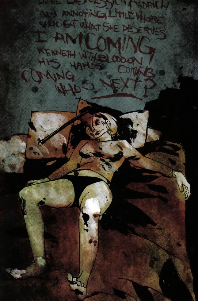 In Issue 2, Jessica is found dead, with an axe buried in her skull, by Kenneth's agent; presumably done by Lauryn LaRoache to make Kenneth think he murdered her, thus turning him into a psycho killer. On the wall above her corpse is a message written in blood: