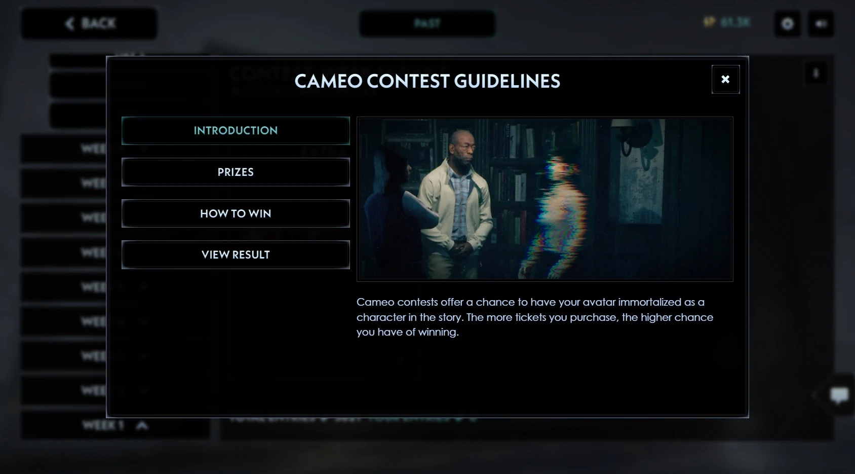 Cameos in Ascension were classified into three types: Starring, Guest Starring and Extra.[6] Starring were cameos that speak in multiple scenes, while Guest Starring were characters that only featured in a specific scene. Extras were non-speaking background characters who had the chance to make an appearance in scenes or interactive segments of the live event known as Endure[7]