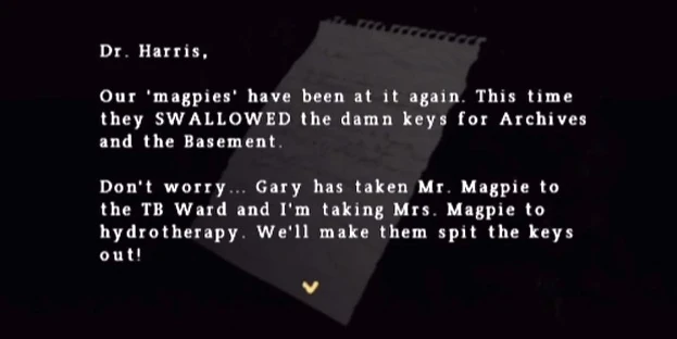 Magpies is a memo found in Silent Hill: Origins by Travis Grady. It is located near the door leading into a doctor's office on the first floor of Cedar Grove Sanitarium. The memo is addressed to a Dr. Harris, regarding a pair of troublesome patients.