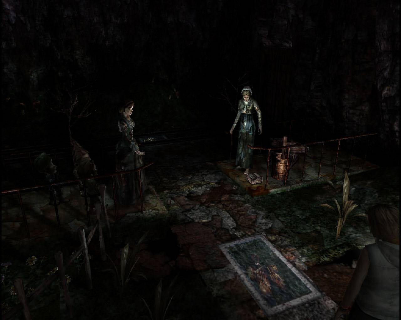 Before being allowed to pass, Heather must "complete" the two dolls at the entrance of the attraction. The doll on the left is of Snow White, with her hand outstretched and some of the dwarfs behind her. The doll on the right is of Cinderella, with a small pedestal to her side. A bit beyond the statues, on the tracks of the cart, are a strew of photos. Two of the photos depict the shadows of the two dolls, but with a small difference. Both dolls are missing an object, and in order to pass, Heather must place a doll head onto Snow White's hand and a red shoe onto Cinderella's pedestal. If the dolls remain incomplete, the door to the next area will stay locked. The two items are found in the following locations: