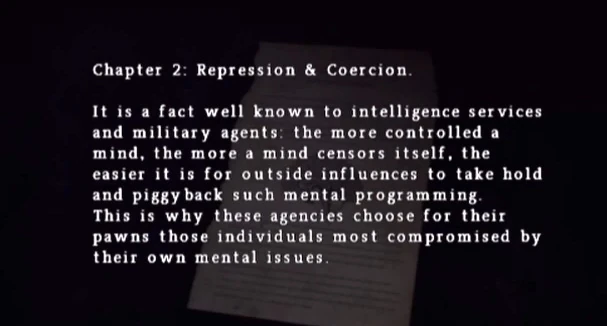 Repression and Coercion is a chapter torn from a book that Travis Grady can find in Silent Hill: Origins. It is located in the library scene on the first floor stage of Artaud Theater's Otherworld.