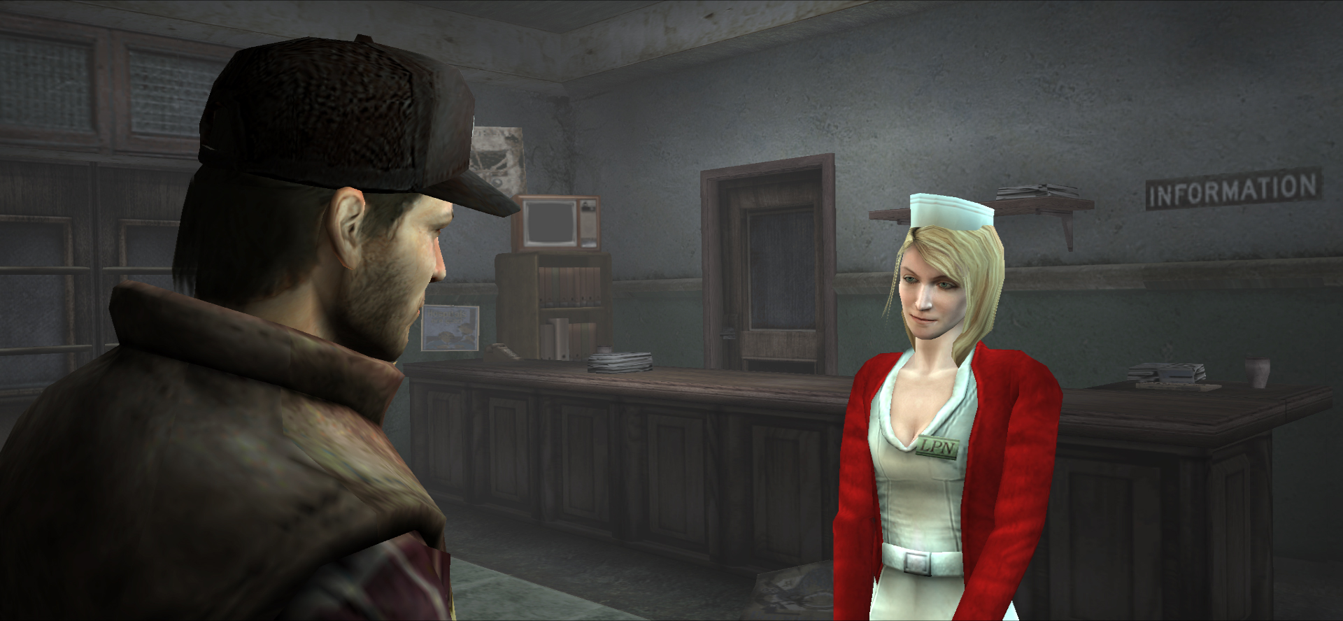 The next day Travis wakes up on a bench in Central Silent Hill. After recalling the events of the previous night, he travels to Alchemilla Hospital in hopes of finding the girl's condition. At the hospital, Travis briefly meets Dr. Michael Kaufmann, but is unable to find out any information, as Kaufmann claims that the hospital has received no new patients. On the second floor of the hospital, Travis is attacked by a nurse monster. After battling with the nurse and continuing his search in the hospital, Travis is confronted by a large mirror with an unusual reflection. On the other side of the mirror which reveals the Otherworld, the brown-haired girl appears and Travis is transported to the hospital's Otherworld.
