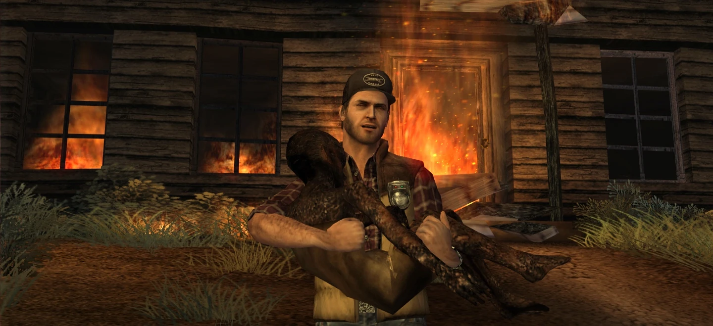 Outside his truck, Travis sees a brown-haired girl in a blue uniform. Chasing after her, Travis finds a house caught in a raging fire. He sees a woman outside of the house, but before he can talk to her, Travis hears a girl's scream from inside and enters the house to find her. After making his way through the burning house, Travis discovers a severely burned young girl lying on top of an apparent sacrificial marking, and carries her outside with the safety of a seal. Upon exiting the house, he hears sirens in the distance and loses consciousness.