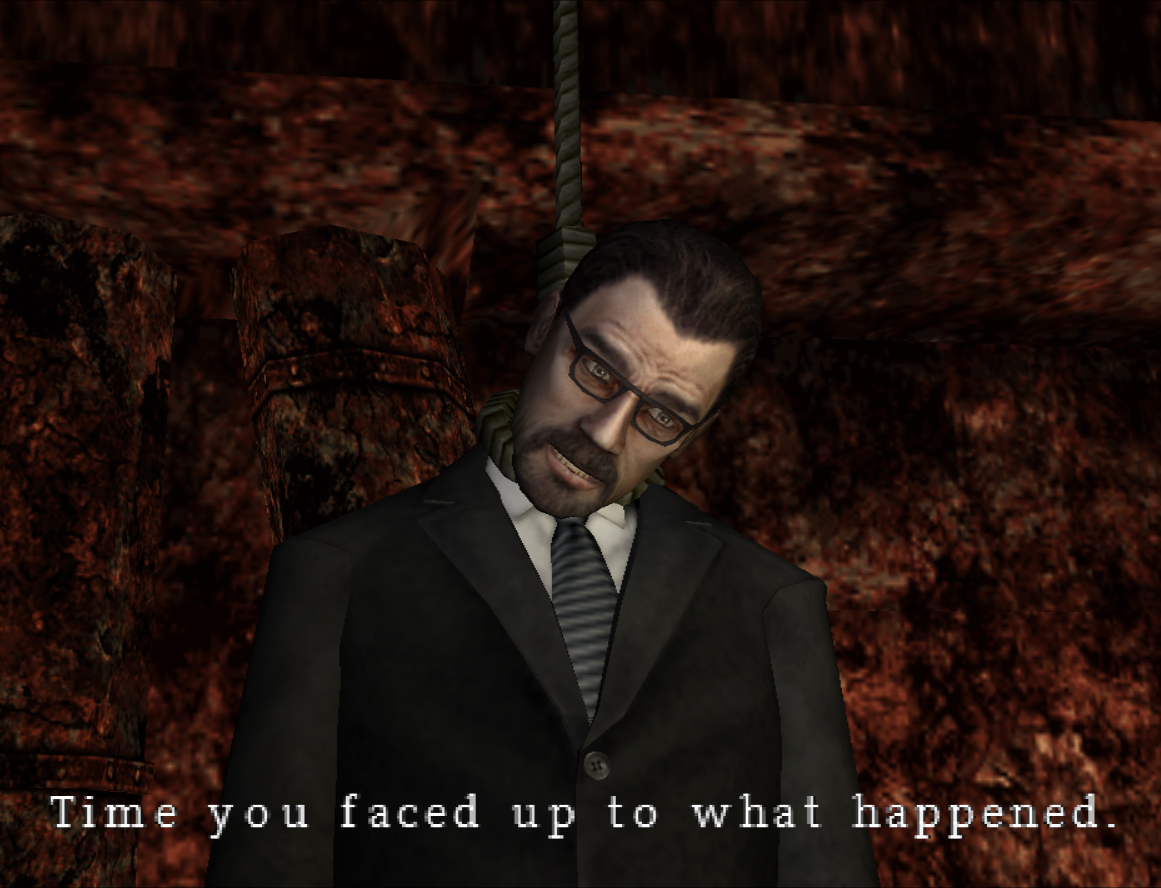 After opening the door to Room 500 and walking down a long diagonal shaft to another doorway, a flashback reveals that his father hanged himself from a noose here. Richard's reanimated corpse tells Travis it's time he "faced up to what happened," and morphs into a screaming, tubular monster trapped in a box hanging from the ceiling. Travis painfully defeats the memory of his father and receives yet another piece of the Flauros. This time, Travis is visibly shaken and turns on Alessa when she inevitably appears. Once again, sirens ring out and Travis collapses. Travis awakens in the basement of the hospital. Inside, he finds the center piece of the Flauros, and reconstructs the mystical item.