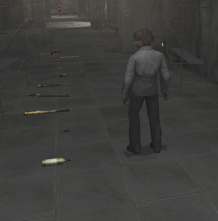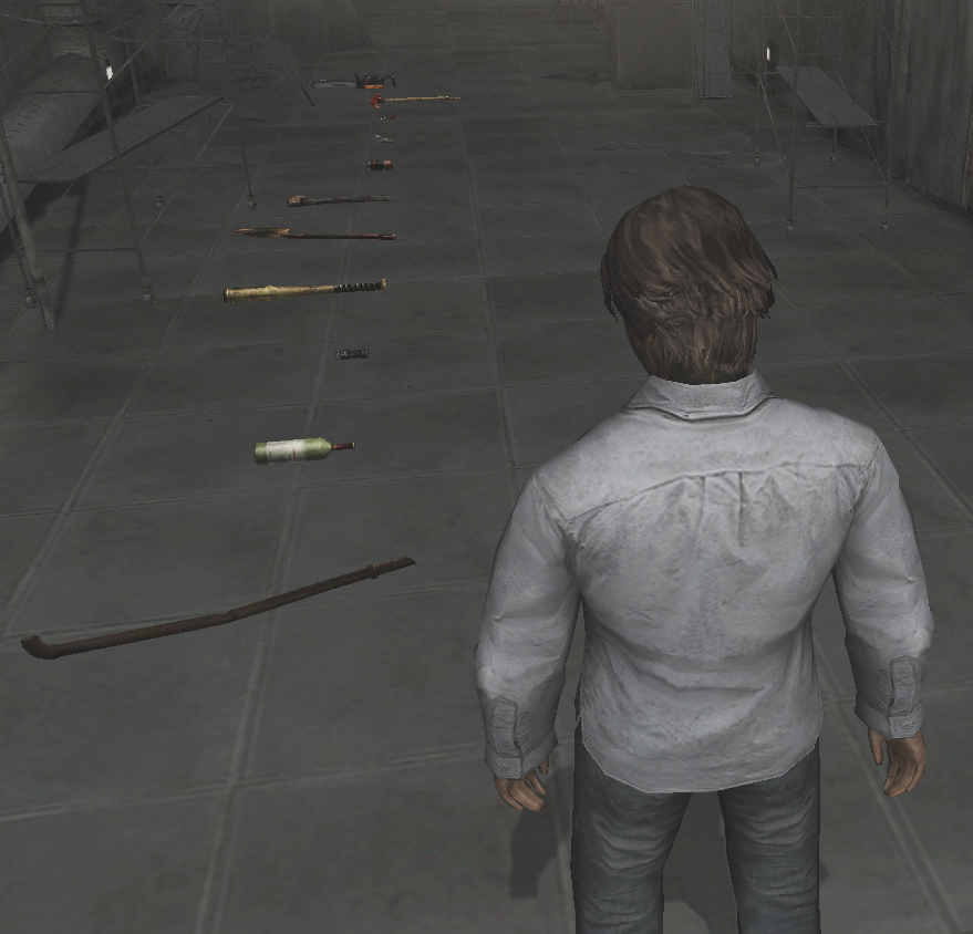 After beating the game on Hard difficulty and achieving a 10-star rank (100 small stars), One-Weapon mode will be selectable when playing a "New Fear" game. In this mode, Henry is allowed to choose one and only one weapon during his entrance to the Subway World. Eleven weapons will be laid out in front of the long escalator; however, picking one of them up causes all the others to disappear. Thus, Henry is allotted only one weapon, with the exception of the pistol, torch, and golf clubs, which will still be found in their respective places. Eileen's submachine gun does not appear in this mode.
