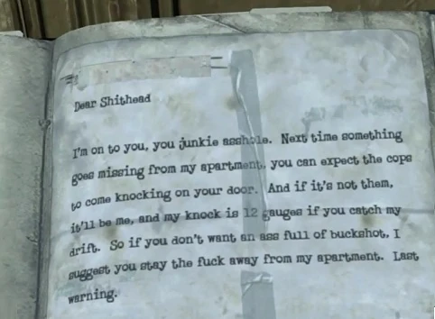 Stolen Goods is a sidequest in Silent Hill: Downpour. This quest is discovered as Murphy Pendleton is exploring the Hillside Apartments.