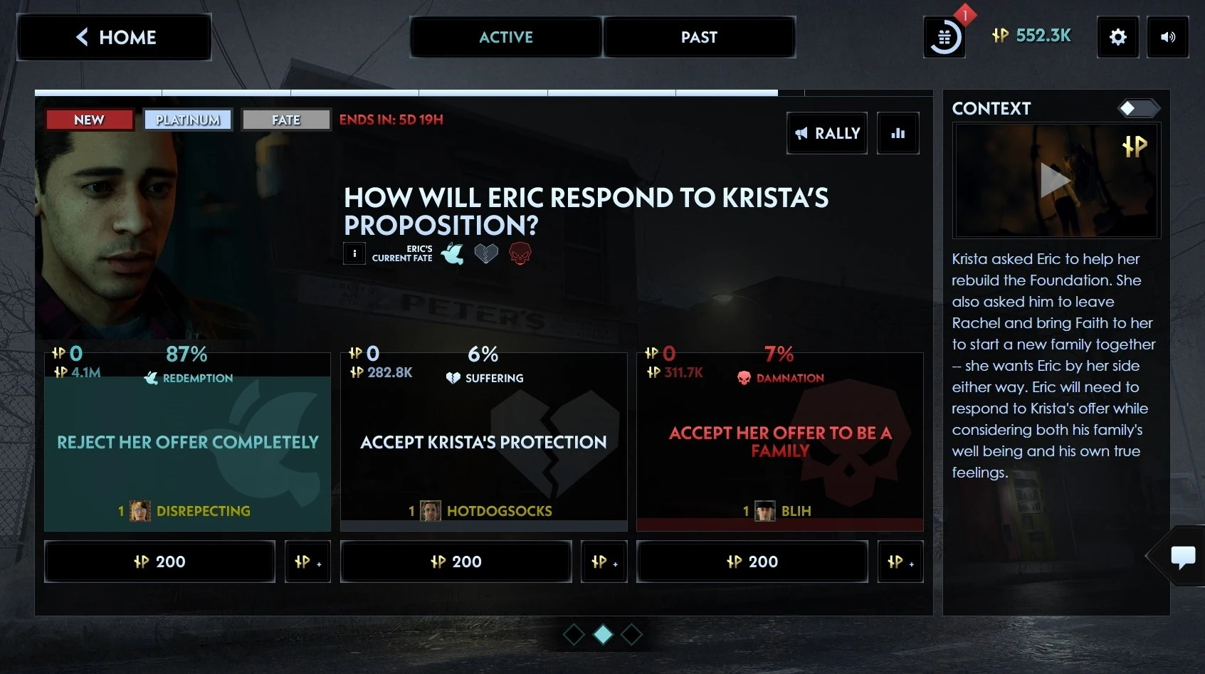 - Note: In Week 16, Genvid Entertainment removed the labels from the Fate system. According to CEO Jacob Navok, this decision was made due to the audience consistently choosing the Redemption outcomes.[7][8]