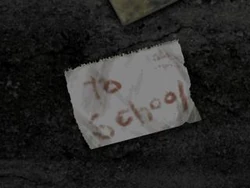 To school is a memo found in Silent Hill. Harry Mason can locate it at the end of Bachman Road's alley next to some rubble. It was left behind by Harry's daughter Cheryl,[citation needed] and it simply directs him to locate her by instructing him to go to the town's school.