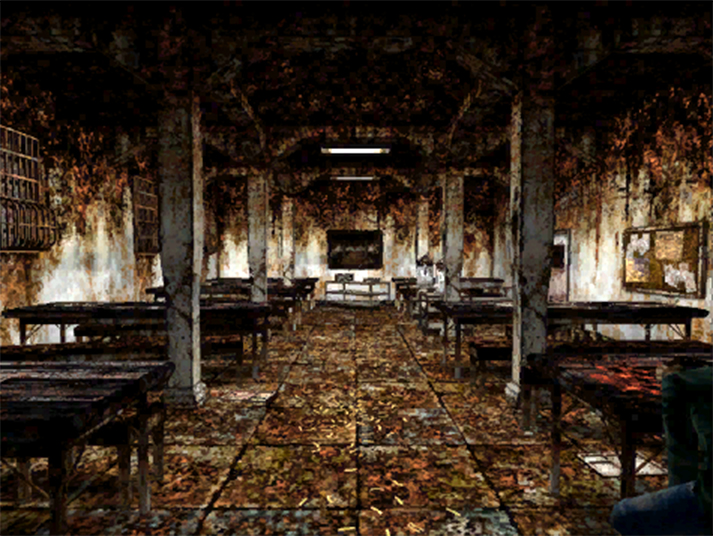 - In the cafeteria, there is a painting of the cafeteria room in its exact state which includes the decaying walls, the dead body of a man lying against the table, and the same painting located at the back of the room.